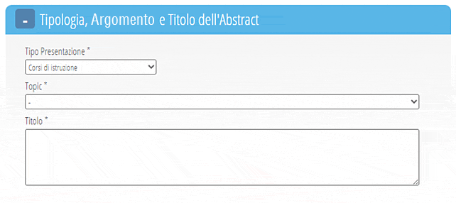 Tipo di Presentazione tra quelli presenti nel menu a tendina, l’Argomento inerente al contributo e il Titolo;